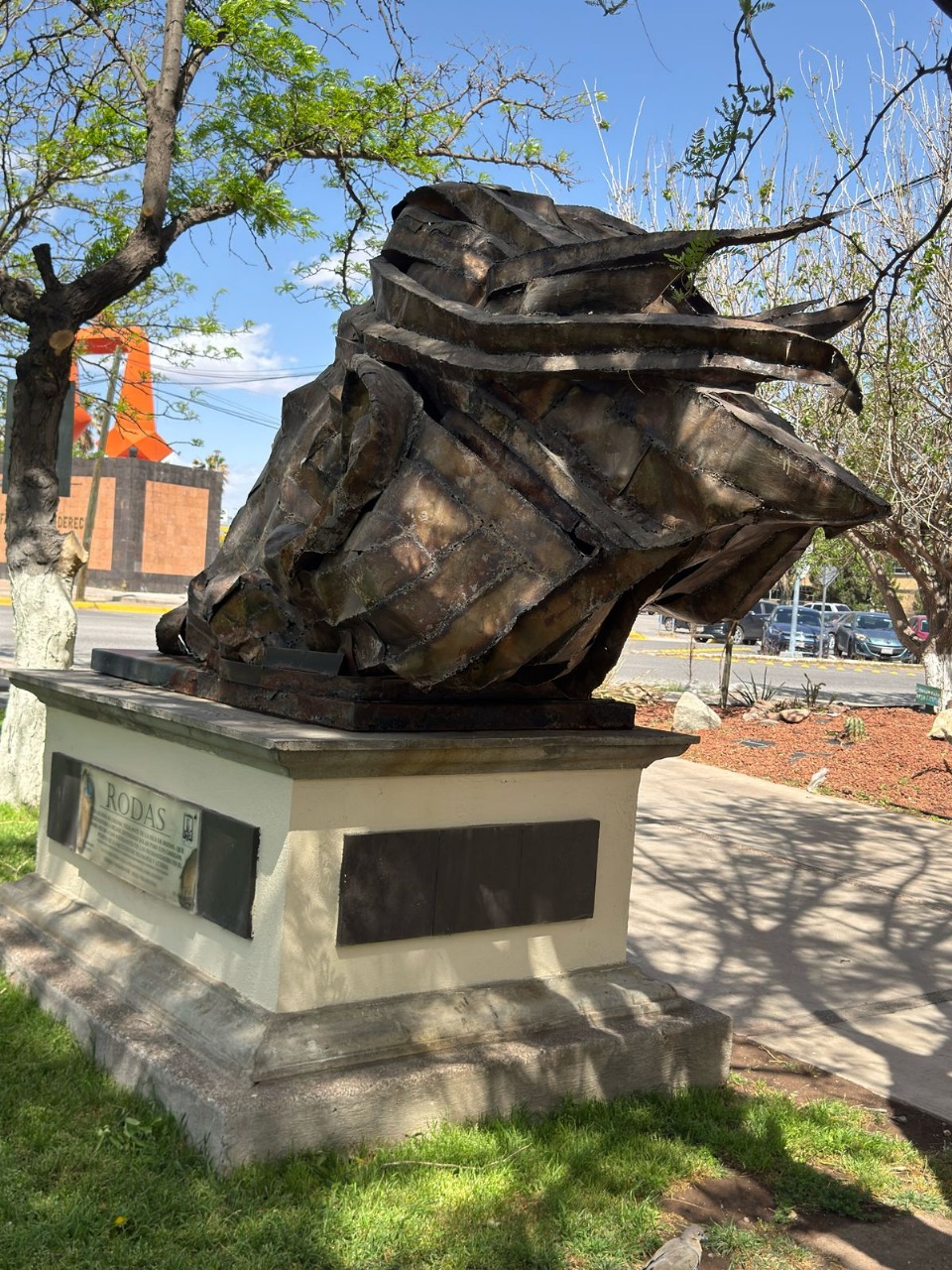 A la entrada de la Facultad de Filosofía y Letras de la Universidad Autónoma de Chihuahua se alza una figura imponente, solitaria y monumental: Rodas, una obra del escultor Guillermo Villanueva. Concebida en 2023, esta pieza no es solamente una estructura metálica; es una declaración simbólica de lo que representa el pensamiento humano en su máxima expresión. Su sola presencia invita a detenerse, observar y reflexionar.